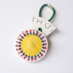 アクリルを加工し、天然由来の繊維(ラフィア・レーヨン・和紙など)やガラスビーズを刺繍したヘアゴムです。